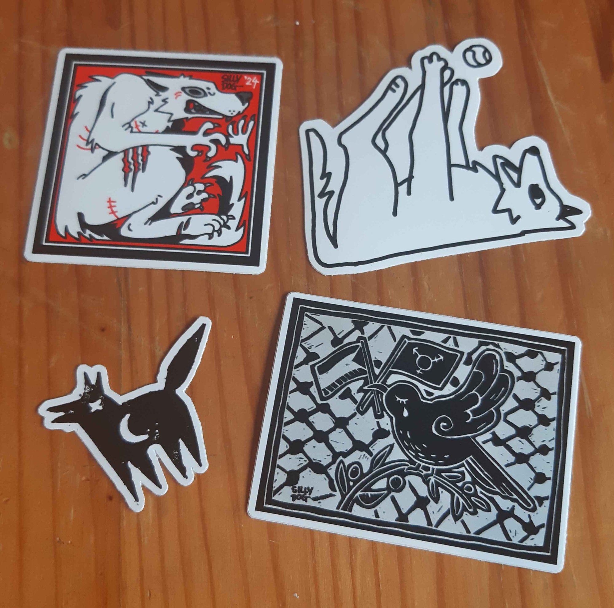 Top left: Trapped Werewolf Top right: Upside-dog Bottom left: SILLYDOG Logo Bottom right: Solidarity Forever Linocut